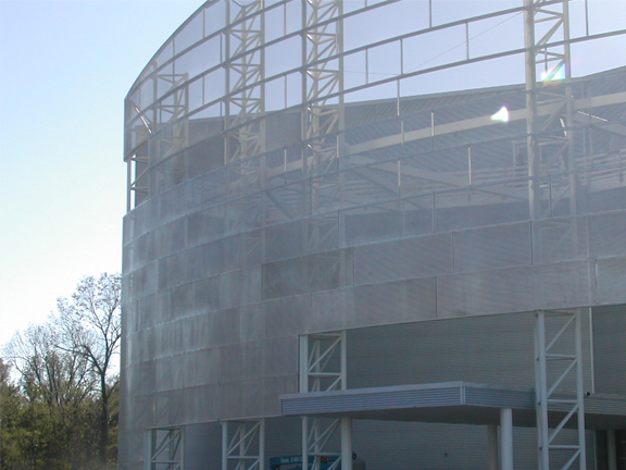Direct Metals® supplied a custom aluminum perforated metal job for Tunica RiverPark & Museum in Tunica, Mississippi. The .125" thick aluminum perforated metal was supplied in three different perforation patterns to give depth and artistic flair to the front façade of the river park building. One-third of the job had a 3/4" diameter hole, the second-third had a 1" diameter hole and the remaining perforated metal was supplied with a 1-1/4" diameter hole. The aluminum perforated metal was fastened to a curved galvanized steel tubing frame to create this custom masterpiece!